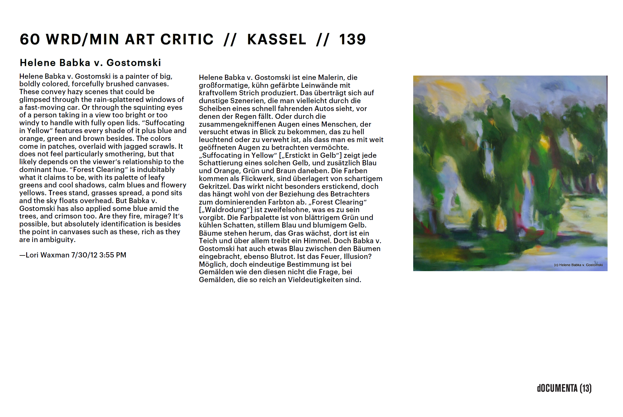 Die Chicagoer Kunstkritikerin Lori Waxman rezensierte auf der dOCUMENTA (13) öffentlich Kunst.
